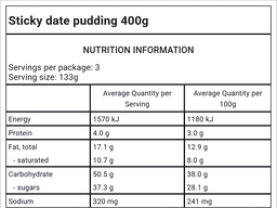 Sticky Date Sponge [Water, Self-raising flour (Wheat), Sugar, Eggs, Dates, Butter (Milk), Bicarb soda], Butterscotch Sauce [Brown sugar, Cream (Milk), Butter (Milk)]
