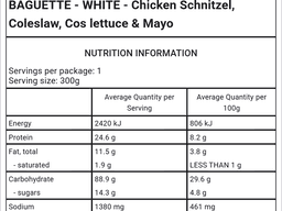 Mayonnaise [Water, Sugar, Eggs, Vinegar, Sunflower oil, Antioxidant (320), Thickener(1422), Salt, Mustard (Sulphites), Vegetable gum, Milk solids, Flavour, Colours (101, 160a)], Baguette White [Water, Flour [Wheat Flour, Thiamine, Folic Acid], Rye flour, Iodised salt, Improver [Antioxidant (300)] (Wheat), Yeast (Wheat)], Carrots, Chicken schnitzel (Wheat), White cabbage, Red cabbage, Cos lettuce, Vegetable oil, Parsley, Chipotle, Lemon