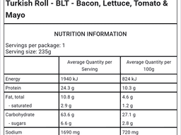 Mayonnaise [Water, Sugar, Eggs, Vinegar, Sunflower oil, Antioxidant (320), Thickener(1422), Salt, Mustard (Sulphites), Vegetable gum, Milk solids, Flavour, Colours (101, 160a)], Bacon [Water, Sugar, Pork, Salt, Mineral Salts(451, 452, 450), Dextrose (Maize), Antioxidant (316), Preservative (250)], Turkish Roll [Water, Eggs, Vegetable oil, Wheat flour, Iodised salt, Yeast (Wheat), Soy flour, Whey powder (Milk), Sodium bicarbonate, Sesame, Thiamine (B12), Folate], Tomato, Lettuce
