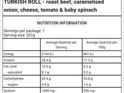 Turkish Roll [Water, Eggs, Vegetable oil, Wheat flour, Iodised salt, Yeast (Wheat), Soy flour, Whey powder (Milk), Sodium bicarbonate, Sesame, Thiamine (B12), Folate], Caramelised onion [Onion, Brown sugar, Sugar, Roast onion puree, Thickener, Salt, Food acid (330), Balsamic vinegar (Sulphites), Brown vinegar, Sherry, Mustard seeds], Roast Beef (sandwiches) [Beef, Ground mustard seeds, Table salt], Tomato, Rocket, Cracked pepper, Salt
