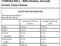 Avocado Cream [Canola oil, Garlic, Cream cheese (Milk), Lemon, Avocado, Salt, Pepper, Preservative (202, 211), Colour (120)], Turkish Roll [Water, Eggs, Vegetable oil, Wheat flour, Iodised salt, Yeast (Wheat), Soy flour, Whey powder (Milk), Sodium bicarbonate, Sesame, Thiamine (B12), Folate], Chicken breast, Brown sugar, Tasty Cheese (Milk), Cracked pepper, Salt, Chilli powder, Sweet paprika, Mustard powder, Onion powder, Garlic powder