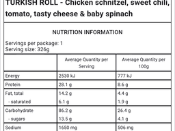 Sweet Chilli Sauce [Water, Sugar, Garlic, Red chilli, Salt, Thickener, Acidity, Regulator (260)], Foccaccia [Water, Eggs, Mixed dried herbs, Vegetable oil, Olives, Barley, Rye, Sesame, Wheat flour, Iodised salt, Yeast (Wheat), Soy flour, Whey powder (Milk), Sodium bicarbonate, Thiamine, Folate], Chicken Schnitzel [Chicken breast, Japanese panko (Wheat Flour, Sugar, Salt, Yeast), Maize flour, Salt, Thickener (412, 415), Herbs & spices], Mozzarella [Tapioca starch, Pasteurised milk, Salt, Rennet (non-animal), Cultures], Tomato, Spinach