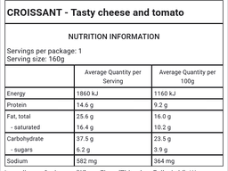 Croissant [Water, Sugar, Ascorbic Acid (300), Wheat flour, Margarine (Animal Fat And Vegetable Oil, Water, butter Fat, Milk Solids, Emulsifier (471, Soy / lecithin), Preservative (202), Antioxidant (320), flavour, Food Acid (330), Colour (160a, Yeast (Wheat), Salt, Bread improver (Wheat Flour, Salt, Malt Flour (Wheat), Emulsifier (472e), Baking additive (355), Inactive Yeast (Wheat), Enzyme], Tomato, Tasty Cheese (Milk)