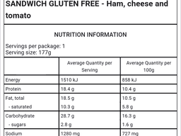 Bread Gluten Free [Canola oil, Water, Brown sugar, Cornstarch, Modified starches gmo free corn & tapioca, Potato starch, Palm oil, Fresh yeast (Soy), Organic psyllium husk, Methyl cellulose, Glucono delta lactone, Iodised sea salt, Sodium bicarbonate, Vinegar, Invert sugar, Xanthan gum, Mono di glycerides, Flaxseed flour, Buckheat flour, Organic Spirulina {Seeds – Linseed, Sunflower Seed, Poppy Seed)], Ham [Canola oil, Water, Sugar, Pork leg, Salt, Acidity Regulator (325), Mineral Salts(451, 452, 450), Thickeners vegetable gums (407a, 412), Dextrose, Pork & beef collagen, Antioxidant (316), Preservative (2250), Yeast extract (Wheat), Colour (120), Herb extract], Tomato, Tasty Cheese (Milk), Cracked pepper, Salt