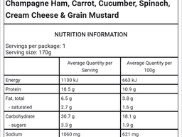 Ham [Canola oil, Water, Sugar, Pork leg, Salt, Acidity Regulator (325), Mineral Salts(451, 452, 450), Thickeners vegetable gums (407a, 412), Dextrose, Pork & beef collagen, Antioxidant (316), Preservative (2250), Yeast extract (Wheat), Colour (120), Herb extract], Bread Wholemeal [Canola oil, Water, Unbleached wholemeal wheat flour, Yeast (Wheat), Wheat gluten, Vinegar, Iodised salt, Soy flour, Vegetable Emulsifiers (481, 471, 472e), Vitamins And Minerals (Thiamin, Niacin, Folic Acid, Vitamin B6, Vitamin E, Iron, Zinc)], Sweet Mustard Pickle [Water, Onion, Capsicum, Sugar, Garlic, Gherkins (Sulphites), Firming Agent(509), Preservative (Soduim Metavisulphite), Thickener, Salt, Mustard seeds, Food acid (330), Turmeric, Spices], Tasty Cheese (Milk), Cream cheese (Milk), Salt, Light milk