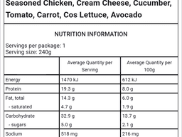 Bread Wholemeal [Canola oil, Water, Unbleached wholemeal wheat flour, Yeast (Wheat), Wheat gluten, Vinegar, Iodised salt, Soy flour, Vegetable Emulsifiers (481, 471, 472e), Vitamins And Minerals (Thiamin, Niacin, Folic Acid, Vitamin B6, Vitamin E, Iron, Zinc)], Avocado Cream [Canola oil, Garlic, Cream cheese (Milk), Lemon, Avocado, Salt, Pepper, Preservative (202, 211), Colour (120)], Chicken breast, Carrots, Brown sugar, Cos lettuce, Cucumber, Tomato, Cracked pepper, Chilli powder, Sweet paprika, Mustard powder, Onion powder, Garlic powder