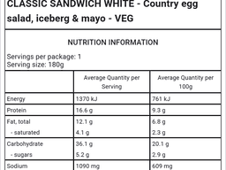 Tomato, Cracked pepper, Salt, White Bread [Canola oil, Water, Unbleached wheat flour, Wheat fibre, Yeast (Wheat), Modified tapioca starch (1413), Wheat gluten, Vinegar, Iodised salt, Soy flour, Acacia gum, Cultured wheat flour, Vegetable Emulsifiers (481, 471, 472e), Vitamins And Minerals (Thiamin, Niacin, Folic Acid, Vitamin B6, Vitamin E, Iron, Zinc)], Eggs, Mayonnaise [Water, Sugar, Eggs, Vinegar, Sunflower oil, Antioxidant (320), Thickener(1422), Salt, Mustard (Sulphites), Vegetable gum, Milk solids, Flavour, Colours (101, 160a)], Iceberg lettuce, Cream cheese (Milk), Parsley, Light milk