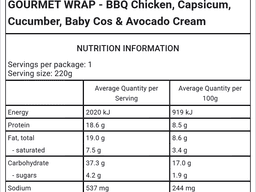 Avocado Cream [Canola oil, Garlic, Cream cheese (Milk), Lemon, Avocado, Salt, Pepper, Preservative (202, 211), Colour (120)], Tortilla Wrap [Water, Sugar, Wheat flour, Thiamine, Folic acid, Vegetable shortening, Baking powder, Mineral Salts (450,500,341), Acidity Regulator (297), Iodised salt, Mineral Salt (500), Preservative (282), Yeast (Wheat)], Chicken breast, Capsicum, Brown sugar, Cos lettuce, Cucumber, Cracked pepper, Chilli powder, Sweet paprika, Mustard powder, Onion powder, Garlic powder