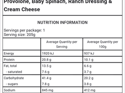 Tortilla Wrap [Water, Sugar, Wheat flour, Thiamine, Folic acid, Vegetable shortening, Baking powder, Mineral Salts (450,500,341), Acidity Regulator (297), Iodised salt, Mineral Salt (500), Preservative (282), Yeast (Wheat)], Beef, Tomato, Spinach, Provolone (Milk), Cream cheese (Milk), Mustard seeds, Light milk, Ranch Dressing [Onion, Sugar, Garlic, Lemon juice, Free range egg, Canola oil, Herbs, Sour cream (Cream, Milk Solids, Thickener (1422 From Maize), Sour cream culture (Milk), Vinegar, Salt, Mustard (Sulphites), Food starch (Maize), Natural flavour, Spices, Citric acid, Natural colour (160a, 160c)]