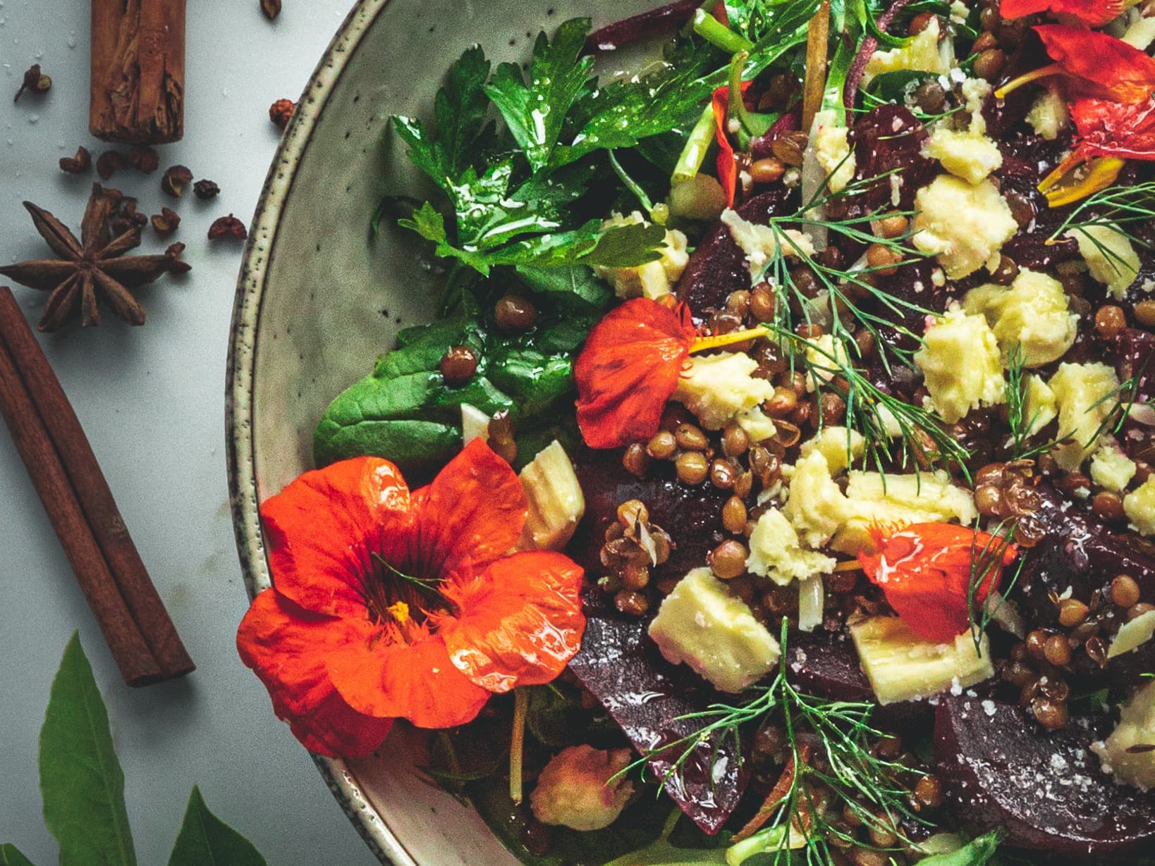 Our Pickled Beetroot Salad is a vibrant medley of flavours and textures. Earthy lentils and tender baby spinach provide a hearty base, while the pickled beetroot adds a tangy and sweet kick. Crowned with shavings of Maffra Aged Cheddar, this salad is a blend of earthy, zesty, and savoury taste.