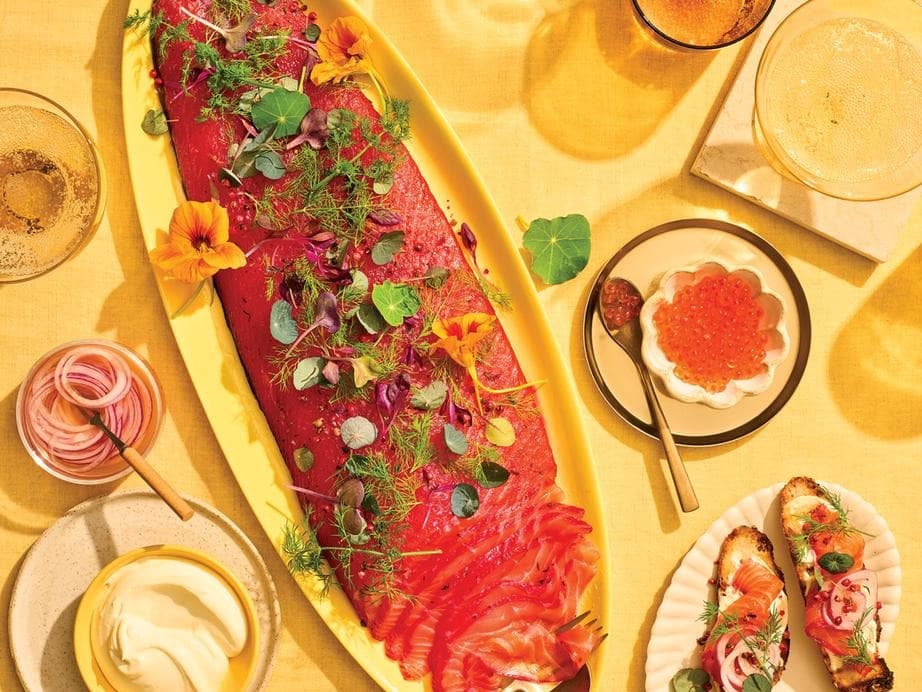 A classic gin-cured salmon with the addition of beetroot, creating an extra impressive dish for entertaining. Pair it with a signature gin-based cocktail, or simply serve with perfectly chilled Champagne. (gf) 500g cured salmon plus dill crème fraiche