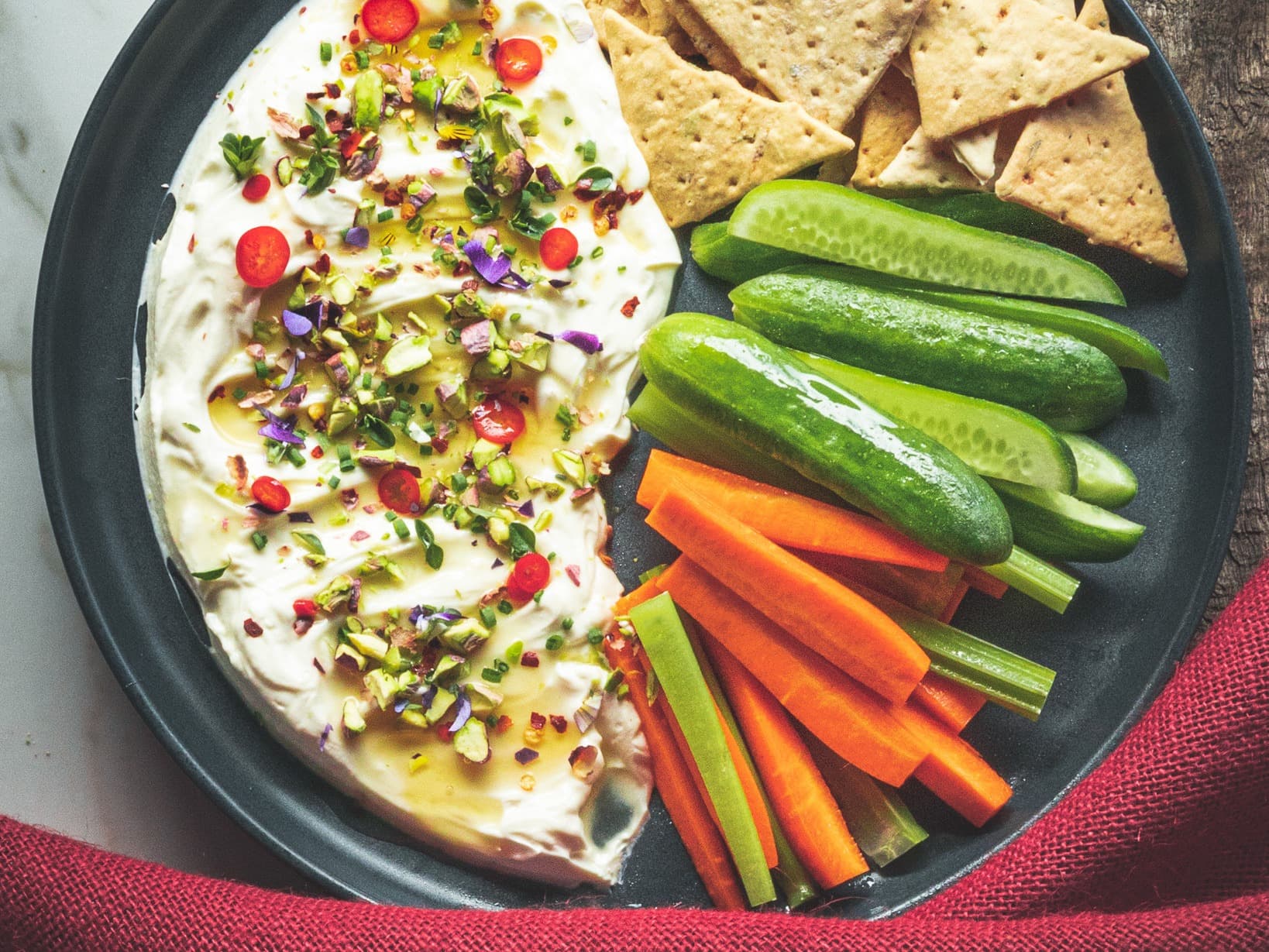 This is one of my favourite dips and being on a dairy farm I am lucky enough to be able to make my own feta and whip this little bowl of goodness up. It pairs with any other items you have on a mezza board and comes with Fig & Olive crackers and fresh vegetable crudités. All you have to do is lay it out on a board and enjoy. Small: 125g dip serves 2-3 adults Medium: 250g serves 4-5 adults