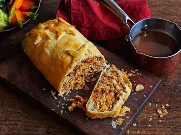 A delectable fusion of wholesome nuts, seeds, and vegetables encased in golden, flaky pastry. With each slice, savour the hearty texture and nutty richness of the roast, perfectly complemented by the buttery, crisp layers of the pastry. Delivered, ready to bake until golden in your oven.