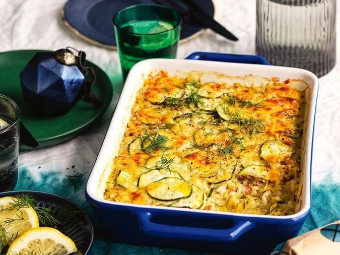 Indulge in the comforting layers of our zucchini, bacon and mascarpone gratin. Thin slices of zucchini intermingle with crispy bacon, creating a medley of textures and smoky flavours. The crowning glory is the luscious mascarpone, which lends a creamy richness, transforming each bite into a decadent, experience.