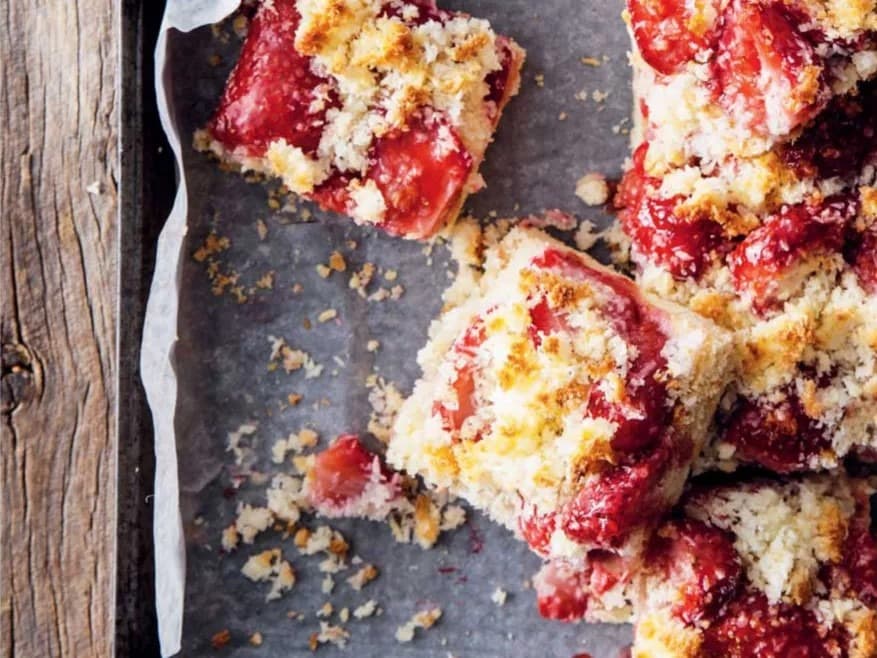A raspberry coconut slice that's crumbly on the outside and gooey on the inside.