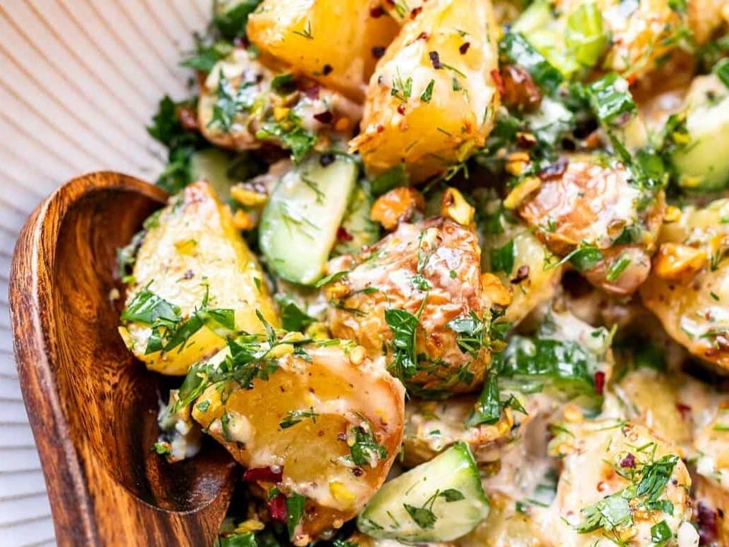 A vibrant, flavourful roasted potato salad with Spring fresh herbs, a zingy dressing and smokey bacon bits. the toasted pistachios give it a extra crunch and lovely nuttiness.