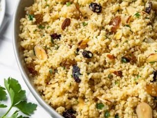 This Moroccan couscous recipe is filled with sweet raisins, crunchy almonds and herbs. It's a flavourful side dish, great with any Tagine.