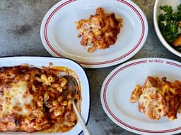 Pasta (Wheat), Tomatoes, Garlic, Basil, Ricotta (Milk), Olive oil, Parmesan (Milk), Mozzarella (Milk), Gruyere (Milk), Salt, Pepper