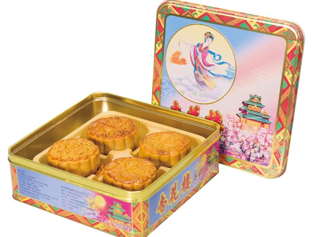 中华老字号 杏花楼 的经典嫦娥铁盒包装,内含 玫瑰豆沙 2 枚 奶油椰蓉 1 枚 绿豆蓉 1 枚 莲蓉 1 枚 五仁 1 枚 木瓜蓉 2 枚