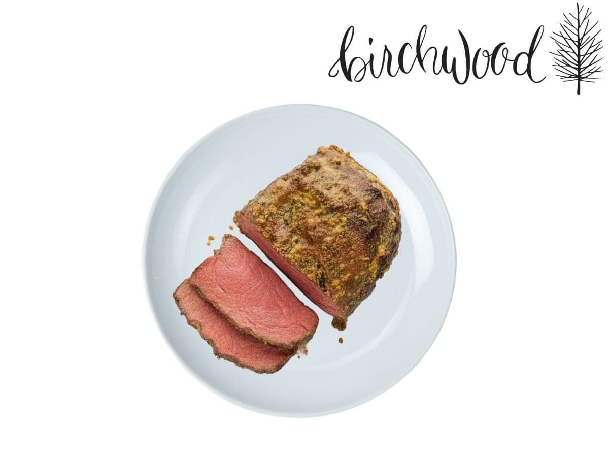 Serves 10-12 | Twice-cooked mustard crusted Black Angus Beef striploin packaged with separate red wine jus included for serving. Packaged slow-cooked once, ready for you place on a roasting dish in the oven to roast/twice-cook.