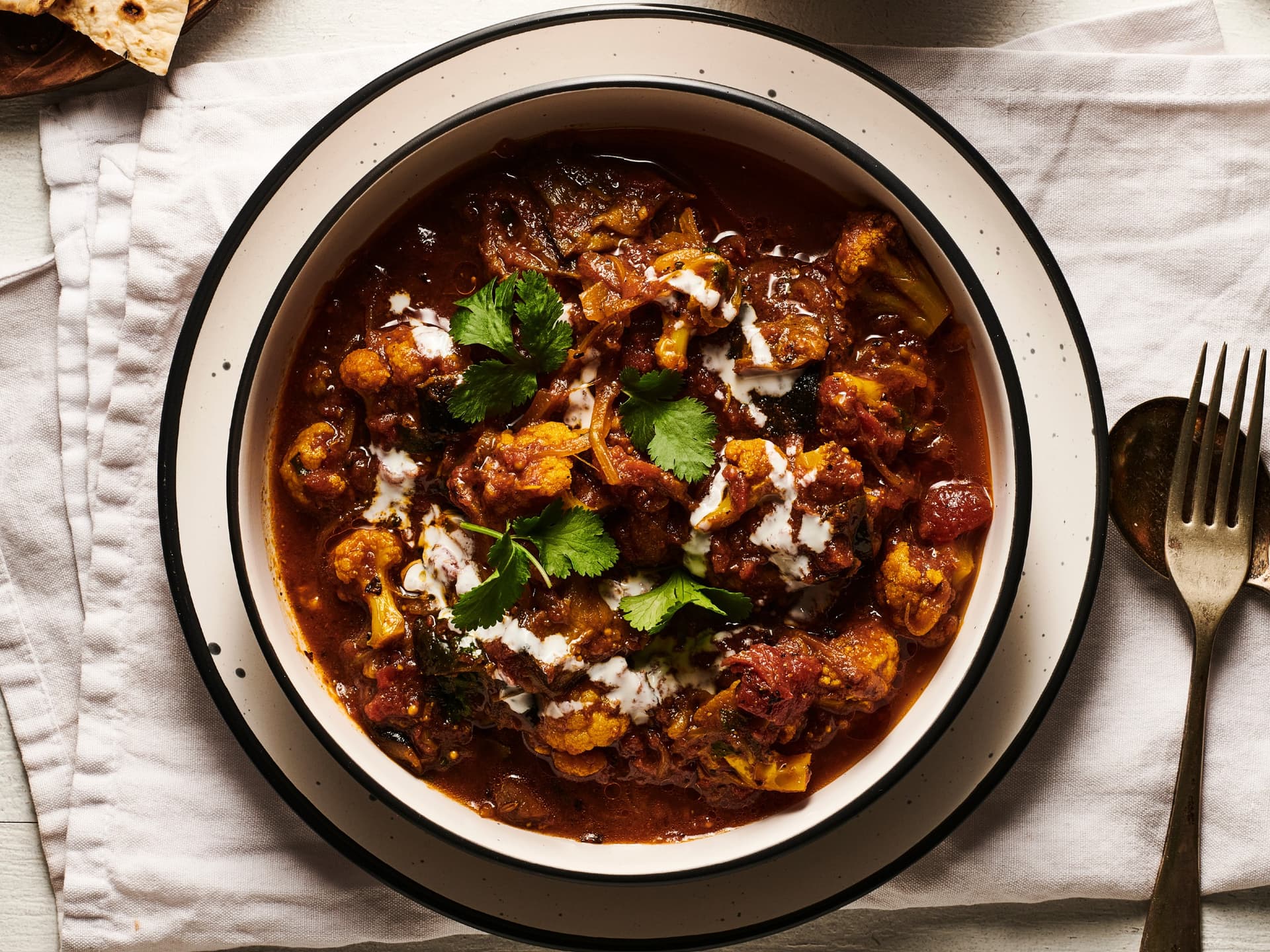 A vibrant vegetarian curry full of warmth and spice. Tender cauliflower and silky eggplant are simmered in a rich tomato base with onion, ginger, garlic and green chilli. Fragrant with cumin, coriander, turmeric and mustard seeds, this is a satisfying plant-based dish that’s perfect with rice or warm flatbread.