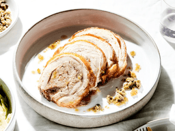 Boned & rolled loin of western plains pork deftly stuffed with a vegetable, dried fruit & herb mixture and roasted to crisp crackle on the outside and juicy succulence on the inside.