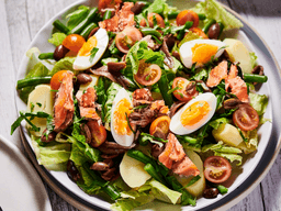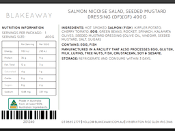 Seeded mustard dressing [Salt, Sugar, Olive oil, Mustard seed, Vinegar (Sulphites)], Hot smoked salmon (Fish), Spinach, Egg, Kipfler potato, Cherry tomato, Green beans, Rocket, Kalamata olives