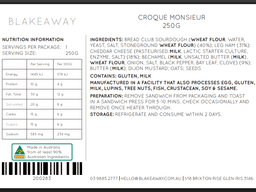 A French café classic, done the BLAKEAWAY way. Layers of smoked ham, cheddar, béchamel and Dijon mustard are tucked between slices of sourdough — already buttered and ready to crisp up to golden perfection. Conveniently cryovaced to lock in freshness, this toastie keeps beautifully in the fridge for several days. Simply heat in a pan or sandwich press.