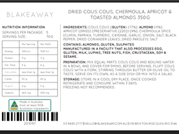 Cous cous (Wheat), Almonds, Dried apricot, Chermoula Spice [Black pepper, Cumin (ground), Paprika, Turmeric, Cayenne, Garlic, Onion, Salt, Dried coriander, Dried parsley], Salt