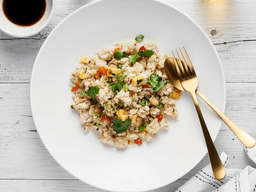A classic wok-fried rice, made the proper way — over a roaring 50,000 BTU flame for that unmistakeable wok hei flavour. This vegetarian version is packed with fresh vegetables, fragrant jasmine rice, and the smoky depth you expect from a great fried rice. Perfect as a kid-friendly dinner on its own, or elevate it with sliced duck and a dash of sriracha for something more grown-up. This dish is fresh and cryovaced to maintain quality and extend its shelf life. Every item is clearly labelled with a best before date. Ready to heat. Family-friendly. Completely meat-free.