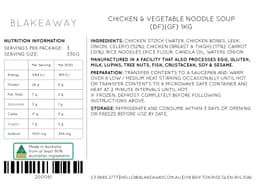 Chicken breast & thigh, Carrots, Rice noodle, Onion, Celery, Leek, Black cabbage, Chives, Thyme, Parsley, Garlic, Salt, Pepper, Bay leaves, Chicken Stock [Water, Chicken bones, Leek, Onion, Celery], Olive oil