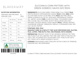 Green Goddess [Sour cream (Milk), Parsley, Coriander, Spring onion, Olive oil, Tarragon, Mayonnaise (Egg), White wine vinegar, avocado], Milk, Zucchini, Basil, Salt, Egg, Corn, Flour (GF), Feta cheese (Milk), Black pepper