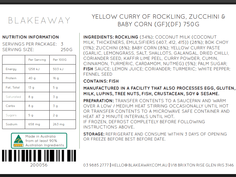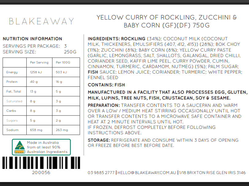 A mild coconut curry of rockling, zucchini, baby corn and subtle fennel spice. Fragrant, warming and full of flavour. Served with fragrant rice.