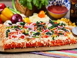 Pizza slab with tomato sauce, cheese, shredded ham, salami, onion & pineapple. Approx 40cm x 30cm