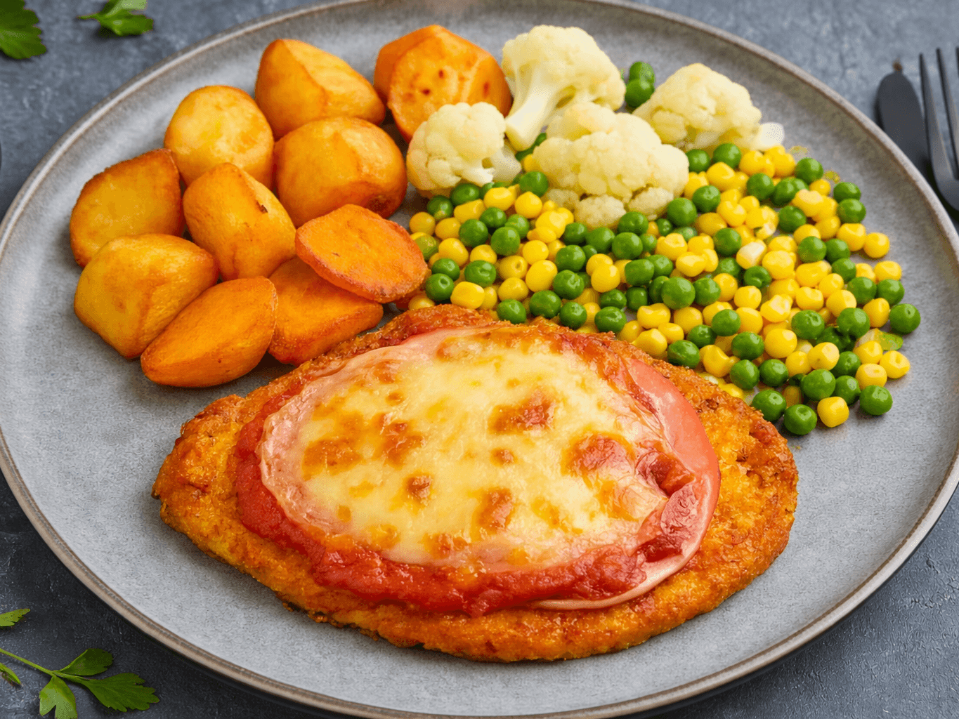 Tender golden-crumbed chicken breast topped with rich tomato sauce, shaved ham, and melted cheese, served alongside crispy roasted potatoes and a medley of steamed seasonal vegetables. A true Aussie classic made for your dinner table.