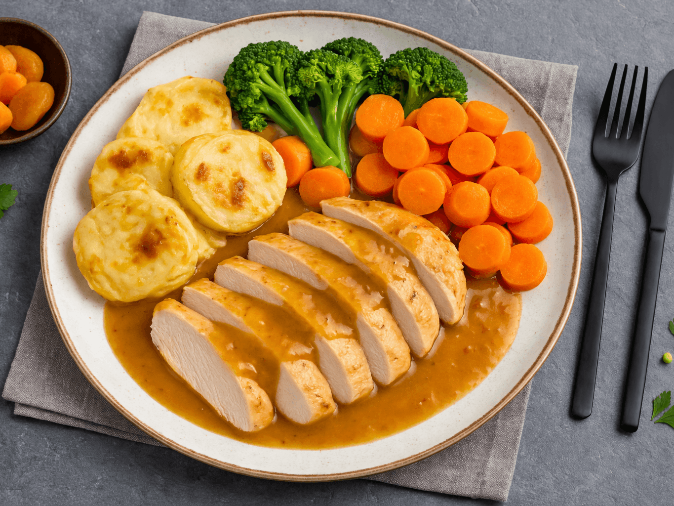 Tender chicken breast served in a lightly sweet apricot sauce, paired with creamy potato bake and seasonal vegetables. This meal offers a beautiful balance of savoury and subtle sweetness, making it a comforting, well-rounded option that’s both satisfying and easy to enjoy any day of the week.