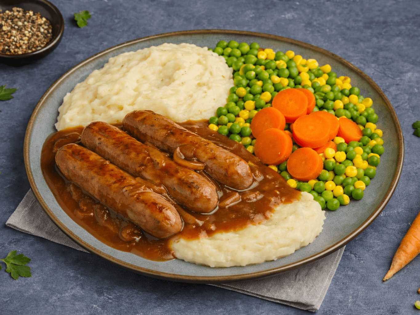 Juicy sausages smothered in rich onion gravy, served with creamy mashed potato and a colourful mix of peas, corn, cauliflower, and green beans — a hearty favourite.