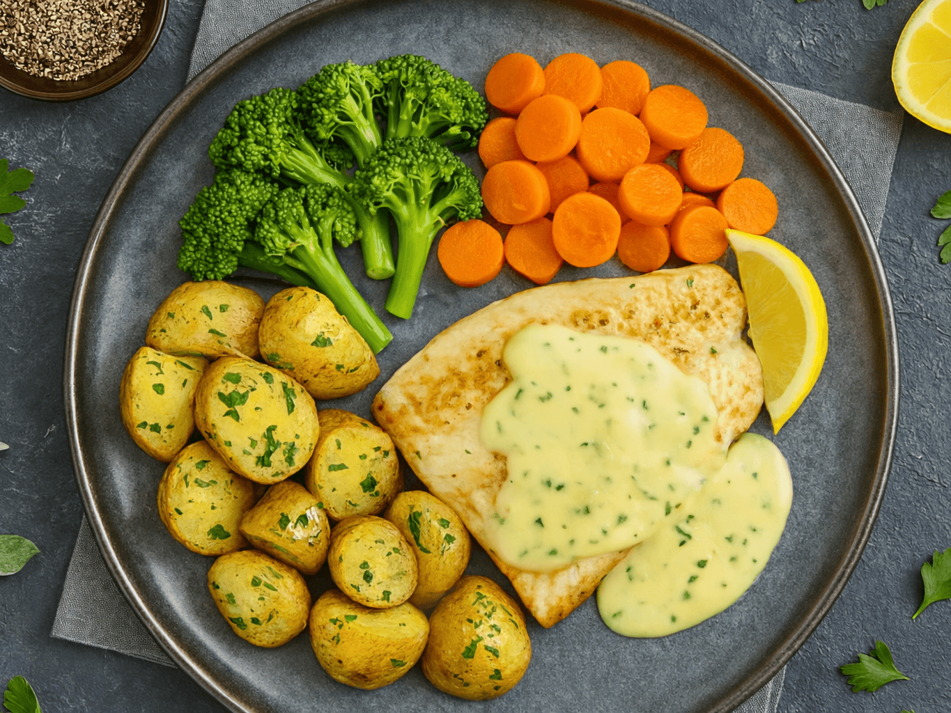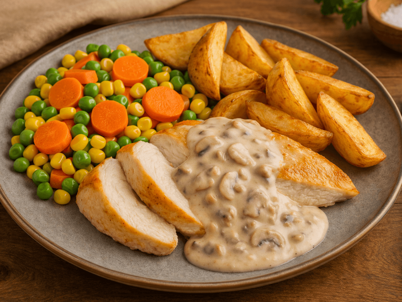 Tender roasted chicken breast smothered in a velvety creamy mushroom sauce, paired with golden baked potatoes and a medley of sweet corn, carrot, and green beans. Comforting, hearty, and packed with flavour.