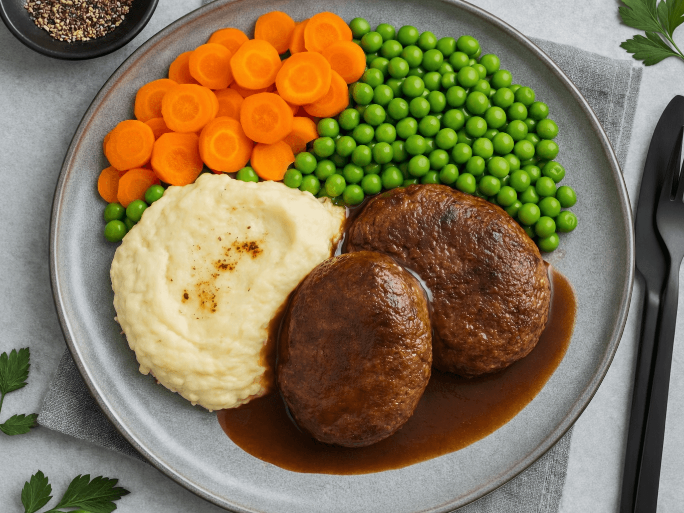 Juicy, homestyle beef rissoles served with rich gravy, creamy mash, and a trio of tender peas, carrots, and cauliflower — a classic, no-nonsense comfort meal that’s hearty, familiar and always a favourite for an easy, satisfying dinner.