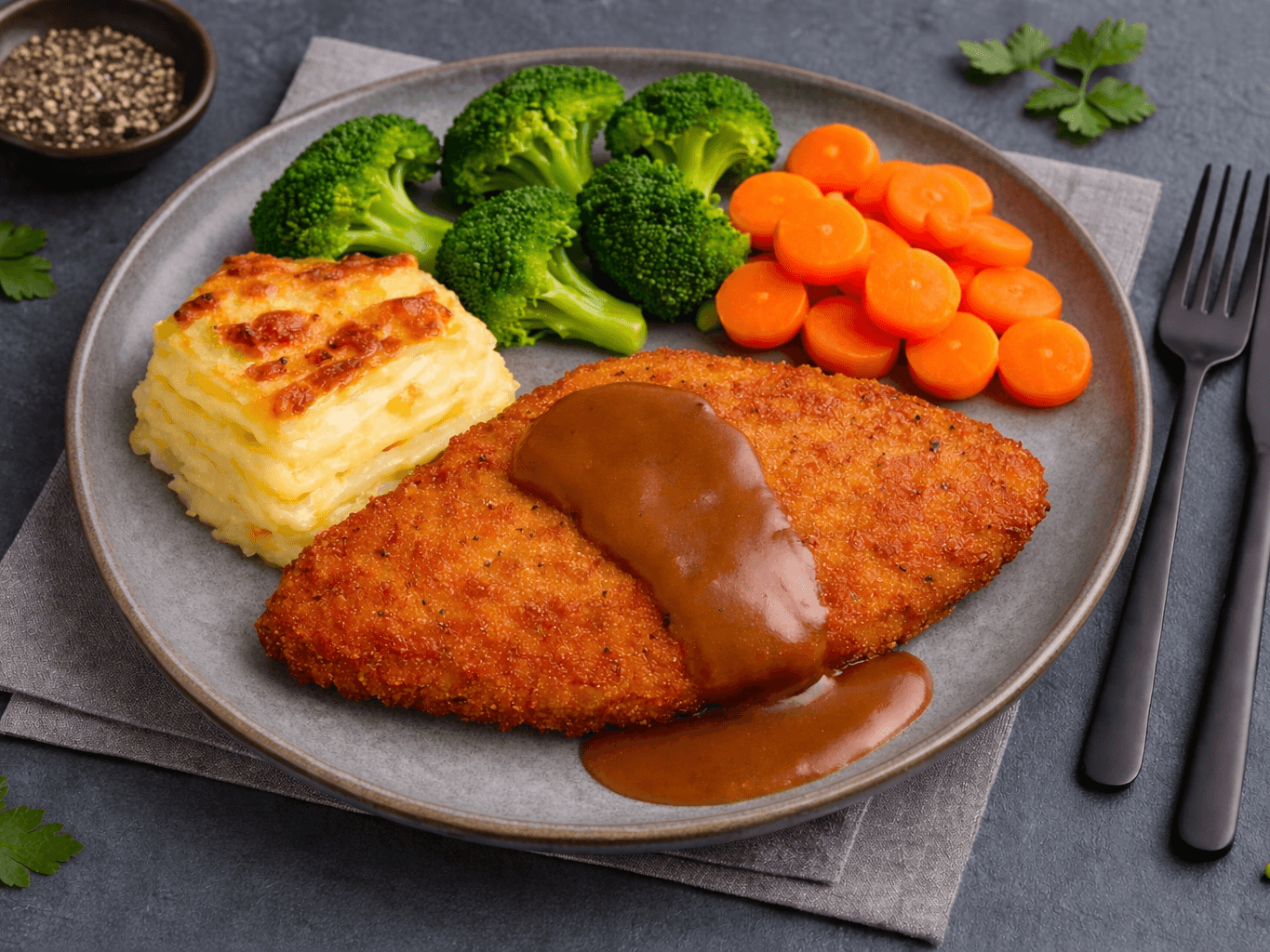 Crispy golden chicken schnitzel topped with rich gravy, served with creamy potato bake and tender broccoli & cauliflower — the ultimate homestyle favourite, satisfying for both lunch or dinner.