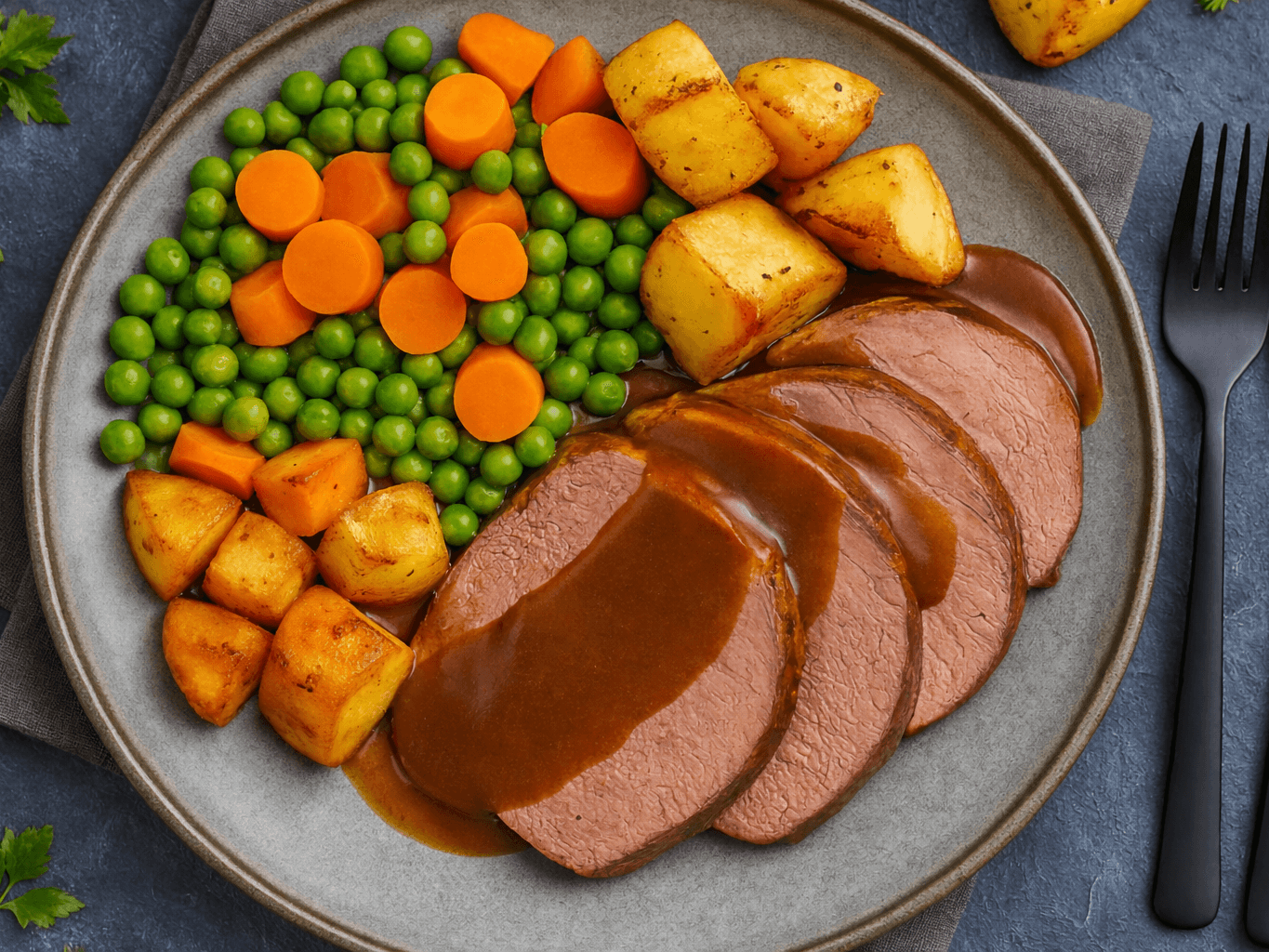 Tender slices of juicy roast beef drizzled with rich homemade gravy, served alongside golden roast potato and a medley of sweet carrots and garden peas — the ultimate homestyle comfort roast.