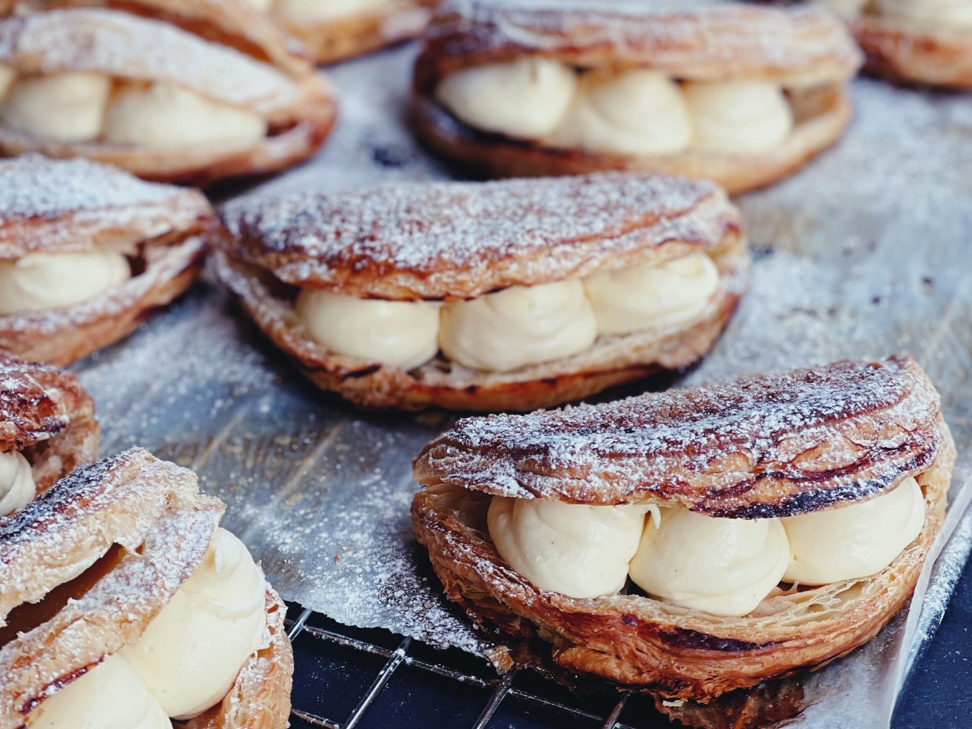 Thick vanilla custard sandwiched between crisp puff pastry and topped with tart passionfruit glaze.