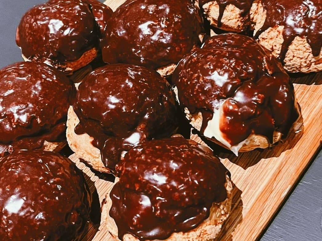House made choux pastry piped with vanilla diplomat and finished with chocolate ganache.