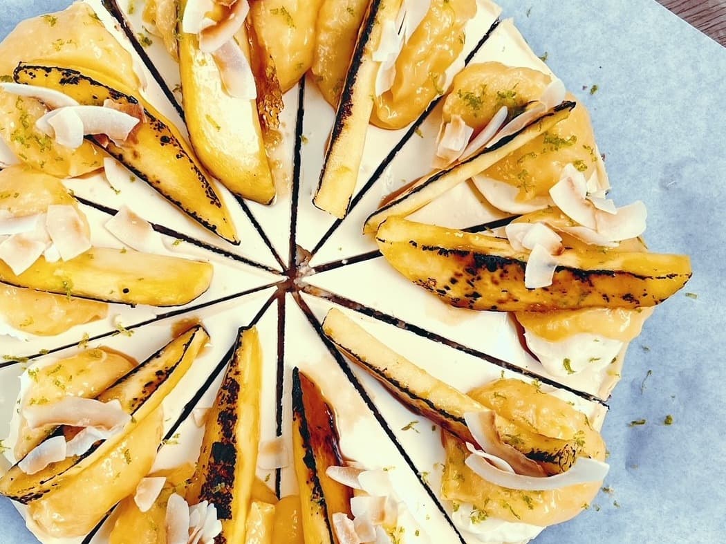 Baked vanilla cheesecake with mango curd, whipped cream and fresh mango.