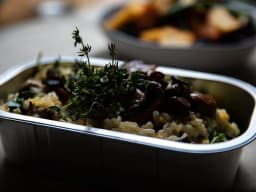 Mushrooms, Arborio rice, White wine, Celery, Feta (Milk), Onion, Butter (Milk), Spinach, Carrots, Oil, Thyme, Crushed garlic, Tuscan seasoning, Vegetable oil, Salt, Pepper