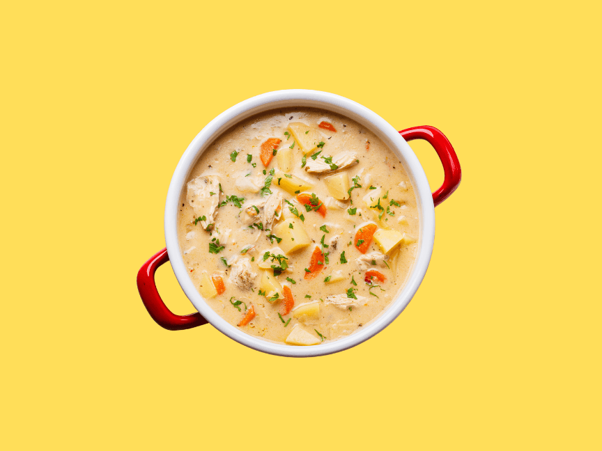 Chicken & Sweet Corn Soup is a flavoured with ginger, garlic, and egg ribbons, it's a warm, hearty, and delicious classic. Served with dinner rolls.