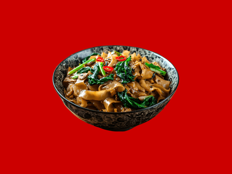 A classic Thai street food dish featuring wide rice noodles stir fried with soy sauce, garlic, seasonal vegetables