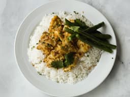 Creamy Chicken Korma served with fragrant rice and beans