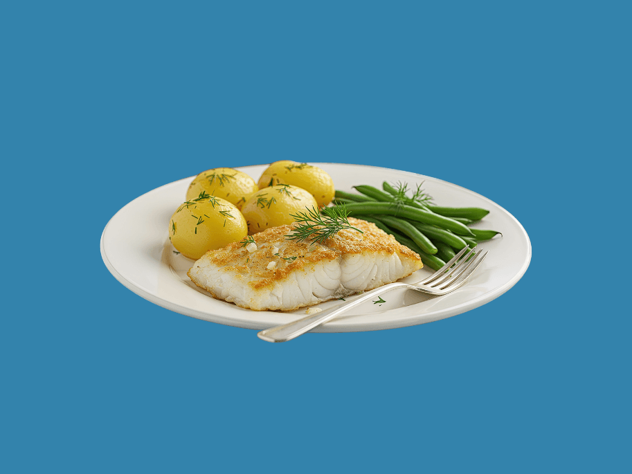 Tender fish fillet topped with lemon butter sauce, served with sautéed potato and crisp beans. # Sample image only