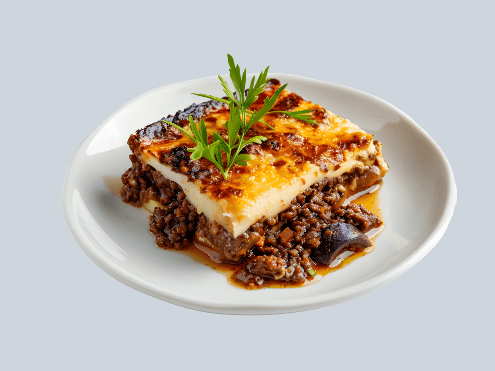 Classic Mediterranean casserole made with layers of sautéed eggplant, spiced minced meat (often lamb or beef), and a rich tomato sauce, all topped with a creamy béchamel sauce and baked until golden. *Sample Image only